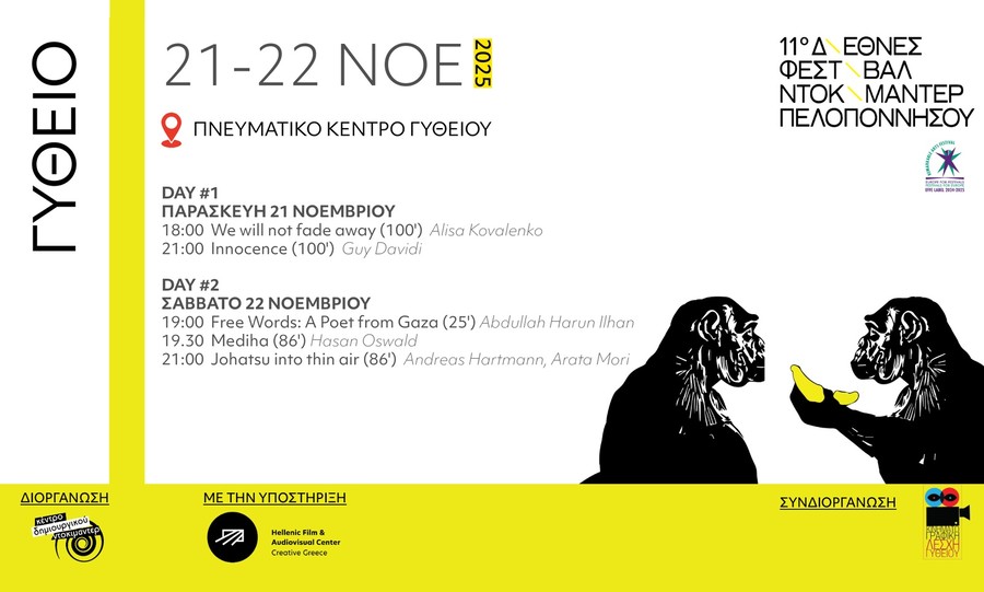 Όπως κάθε χρόνο, έτσι και φέτος, προβάλλουμε και στο Γύθειο το 11ο Διεθνές Φεστιβάλ Ντοκιμαντέρ Πελοποννήσου και συγκεκριμένα στις 21 και 22 Νοεμβρίου 2025, Παρασκευή και Σάββατο αντιστοίχως.