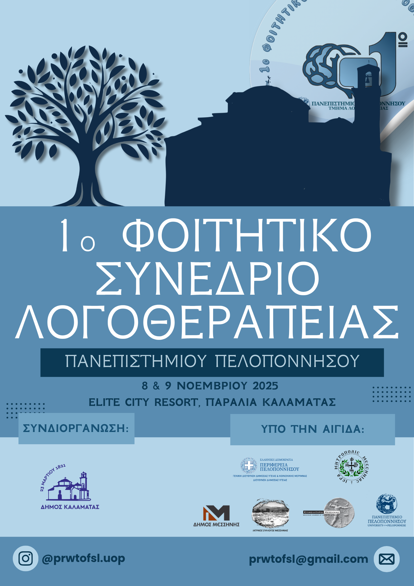 Το 1ο Φοιτητικό Συνέδριο Λογοθεραπείας του Πανεπιστημίου Πελοποννήσου είναι μία πρωτοβουλία των φοιτητών του τμήματος Λογοθεραπείας της Σχολής Επιστημών Υγείας του Πανεπιστημίου Πελοποννήσου. Είναι η πρώτη φορά που διοργανώνεται στην πόλη της Καλαμάτας και αφορά φοιτητές, αλλά και επαγγελματίες του κλάδου.