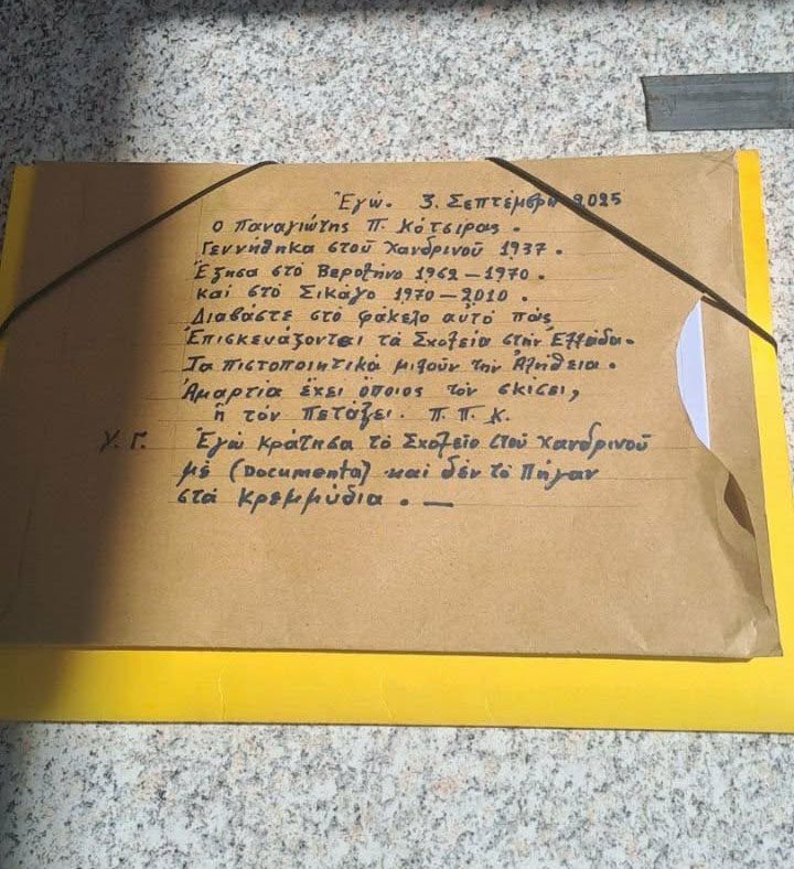 Σε φάκελο, με ημερομηνία 3 Σεπτεμβρίου 2025, έγραφε: «Εγώ, ο Παναγιώτης Π. Κότσιρας, γεννήθηκα στου Χανδρινού το 1937. Έζησα στο Βερολίνο 1962-197. Διαβάστε στο φάκελο αυτό πως επισκευάζονται τα σχολεία στην Ελλάδα. Τα πιστοποιητικά μιλούν την αλήθεια.