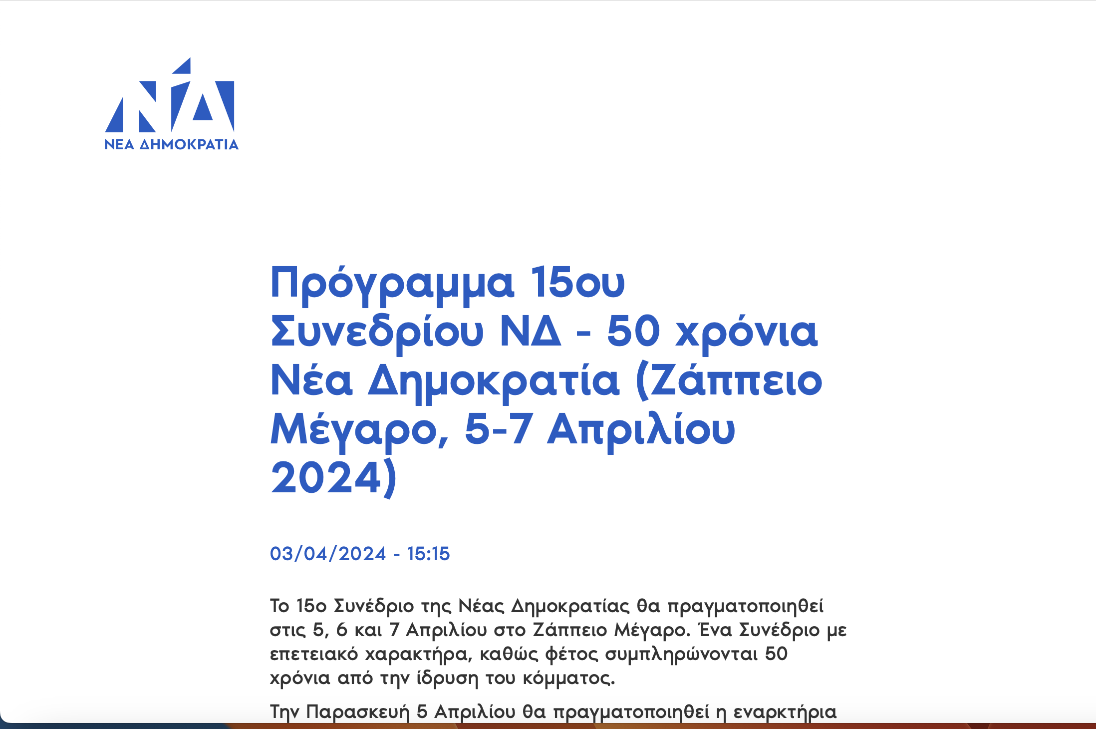 Η ΝΔ πραγματοποίησε επετειακό Συνέδριο για 50 χρόνια τον περασμένο Απρίλιο στο Ζάππειο Μέγαρο. Το σχετικό δελτίο Τύπου τότε ανέφερε: