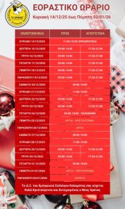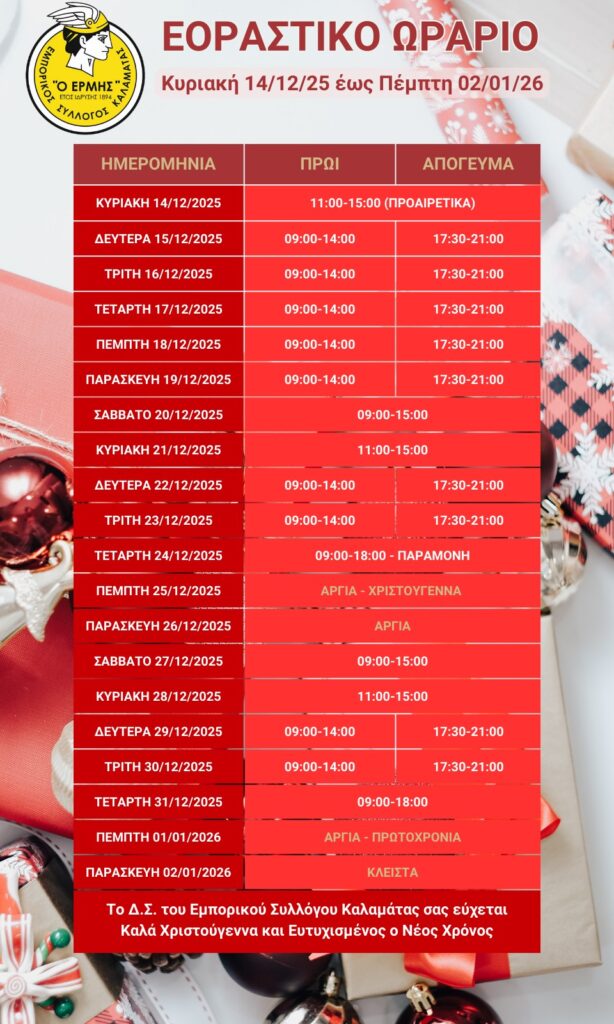 Ανακοινώθηκε το εορταστικό ωράριο των καταστήμάτων της Καλαμάτας από τον εμπορικό Συλλογο Καλαμάτας.