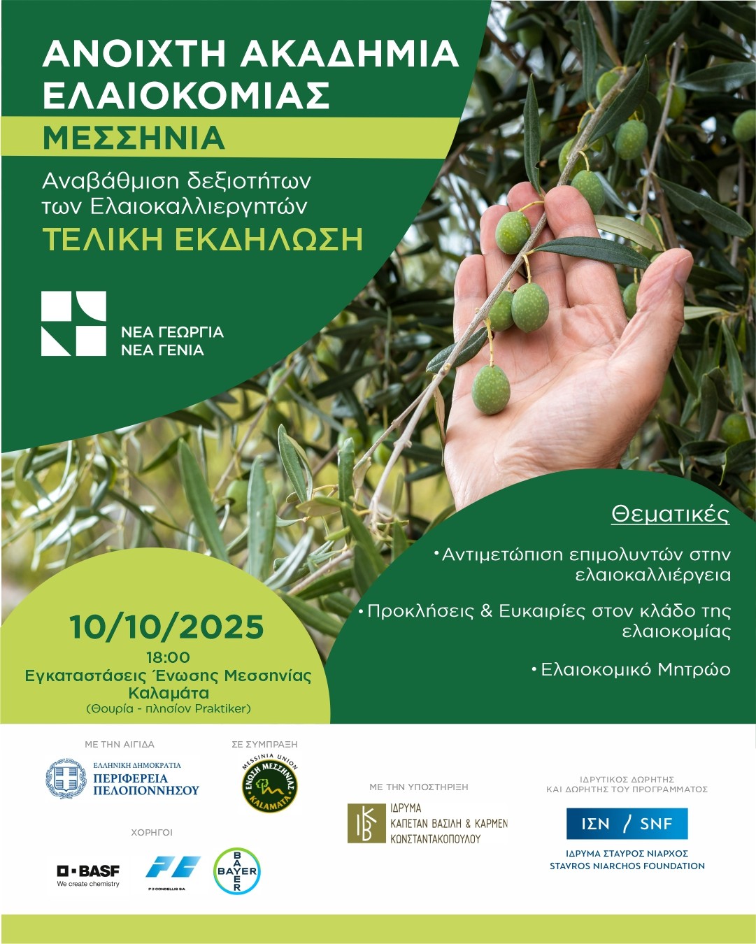 Με μια πλούσια σε περιεχόμενο Τελική Εκδήλωση, ολοκληρώνεται το πρόγραμμα «Ανοιχτή Ακαδημία Ελαιοκομίας – Μεσσηνία», την Παρασκευή, 10 Οκτωβρίου 2025, στις 18:00, στις εγκαταστάσεις του Αγροτικού Συνεταιρισμού «Ένωση Μεσσηνίας» (Ε.Ο. Καλαμάτας – Τριπόλεως, Καλαμάτα 24100).