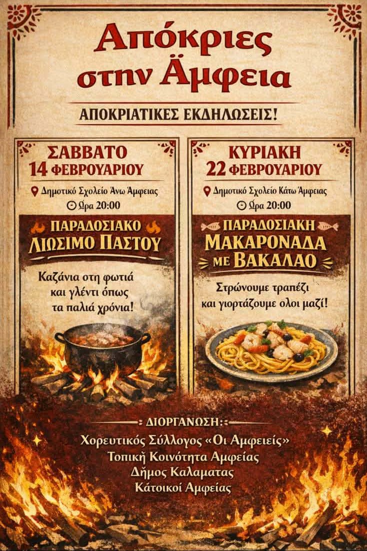 Το Σάββατο 14 Φεβρουαρίου 2026 και ώρ5α 20:00 στο Δημοτικό Σχολείο Άνω Άμφειας θα πραγματοποιηθεί παραδοσιακό λιώσιμο παστού, ενώ την Κυριακή 22 Φεβρουαρίου και ώρα 20:00 στο Δημοτικό Σχολείο Κάτω Άμφειας ντόπιοι και επισκέπτες θα έχουν τη δυνατότητα να δοκιμάσουν την παραδοσιακή μακαρονάδα με βακαλάο. Οι αποκριάτικες δράσεις διοργανώνονται από την Τοπική Κοινότητα Άμφειας και το Δήμο Καλαμάτας σε συνεργασία με το Χορευτικό Σύλλογο «Οι Αμφειείς» και κατοίκους της κοινότητας.