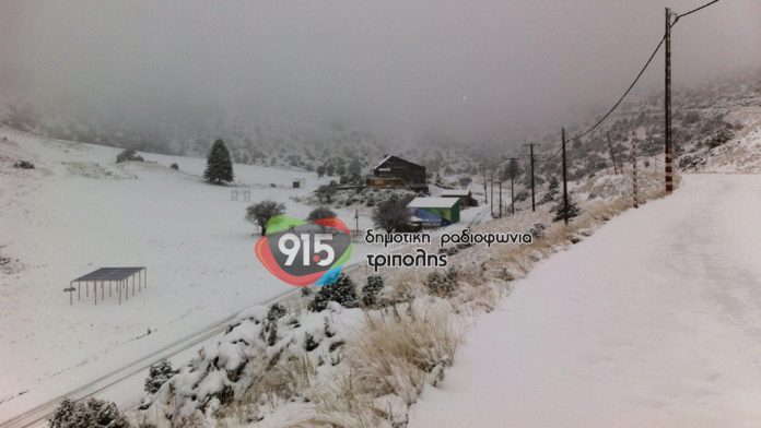 Χιονίζει στο χιονοδρομικό Μαινάλου όπου έχει αρχίσει να το στρώνει σιγά σιγά.
