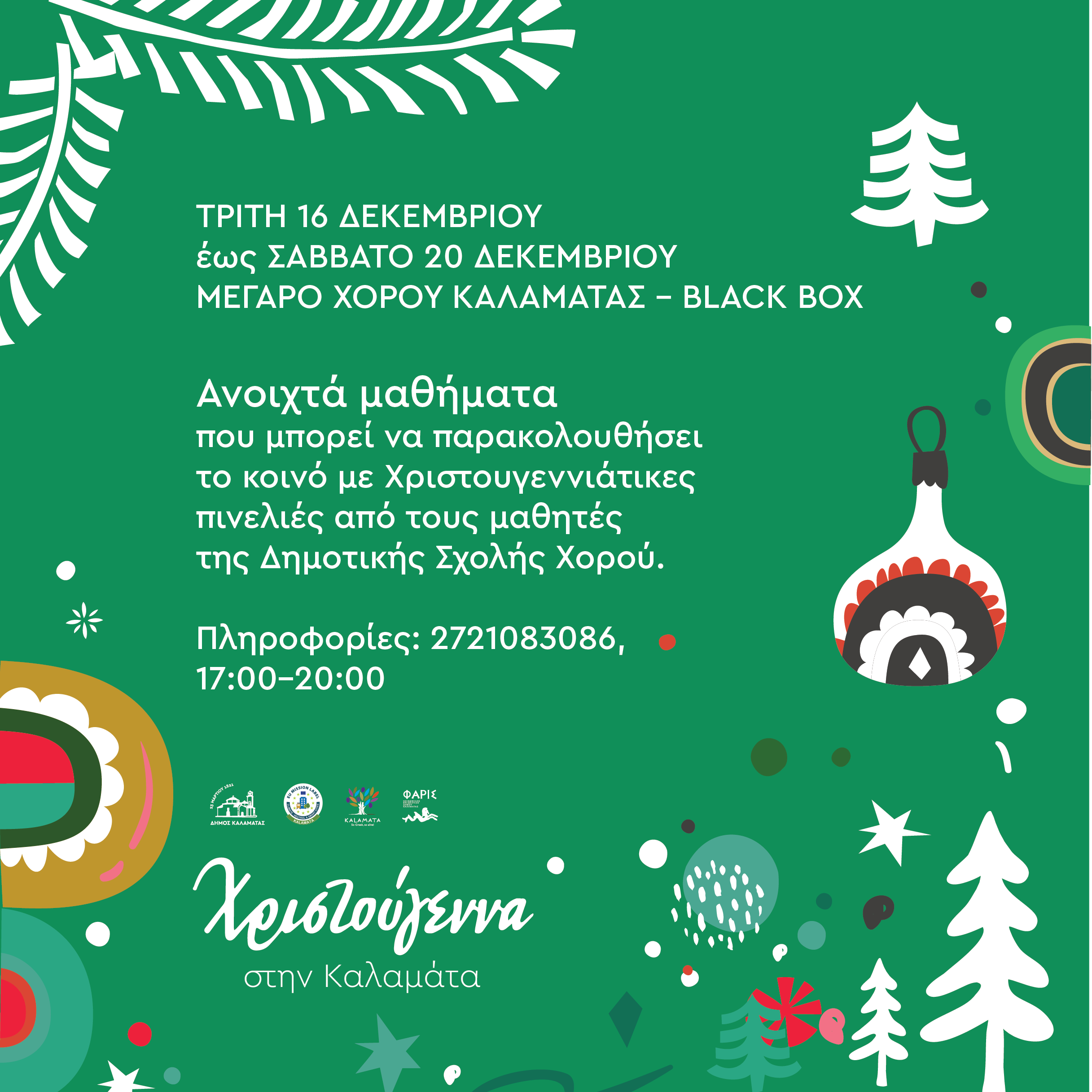 Η Δημοτική Σχολή Χορού Καλαμάτας με χριστουγεννιάτικη διάθεση θα πραγματοποιήσει ανοιχτά μαθήματα με τους μαθητές της σχολής το διάστημα από Τρίτη 16 Δεκεμβρίου μέχρι και το Σάββατο 20 Δεκεμβρίου 2025 στο Black Box του Μεγάρου Χορού Καλαμάτας. Τα μαθήματα θα είναι ανοιχτά για παρακολούθηση για το κοινό.