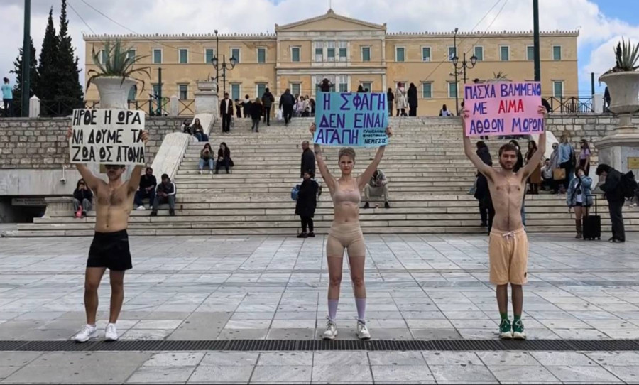 . Σε μια συμβολική διαμαρτυρία στο κέντρο της Αθήνας προχώρησαν σήμερα μέλη της Πανελλήνιας Ομοσπονδίας «Νέμεσις», εκφράζοντας την αντίθεσή τους στη μαζική σφαγή αμνοεριφίων ενόψει του Πάσχα.