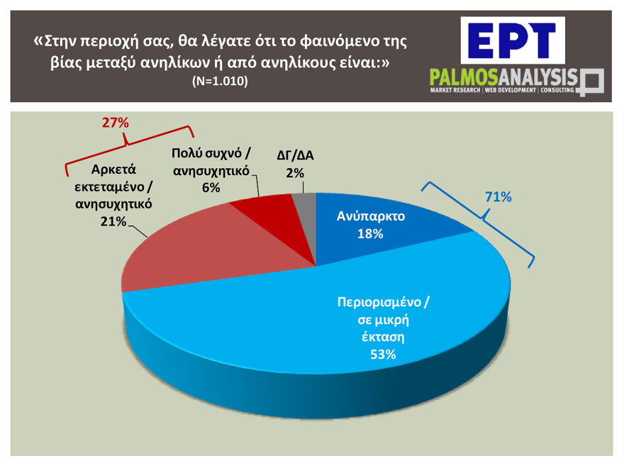Στην ίδια δημοσκόπηση που παρουσιάστηκε το βράδυ της Πέμπτης στην ΕΡΤ , 9 στους 10 πολίτες (91%) χαρακτηρίζουν το πρόβλημα της βίας στη χώρα μας σήμερα ως «Πολύ» (68%) ή «Αρκετά» (23%) σημαντικό.