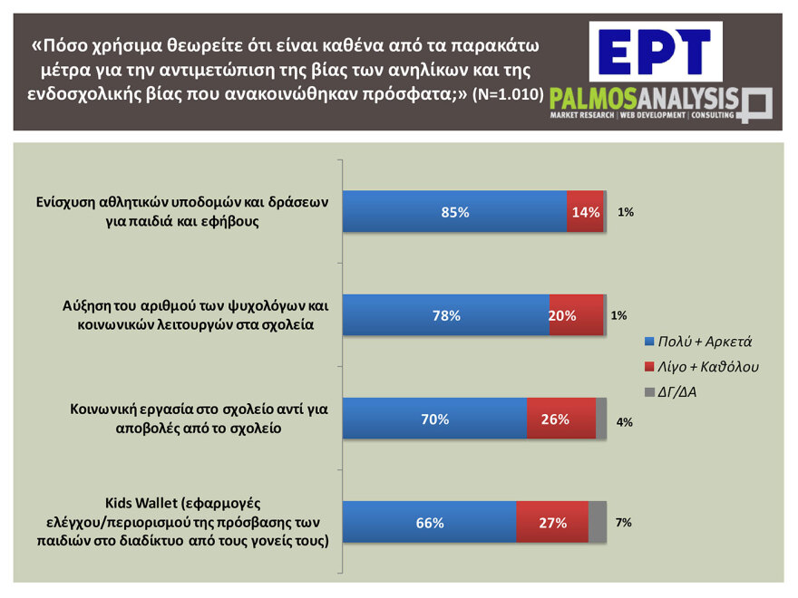 Όσον αφορά, δε, τα μέτρα για την αντιμετώπιση της βίας των ανηλίκων και της ενδοσχολικής βίας, η ενίσχυση των αθλητικών υποδομών και δράσεων για παιδιά και εφήβους θεωρείται «Πολύ» και «Αρκετά» χρήσιμο μέτρο από το 85% των ερωτηθέντων και ακολουθούν η αύξηση του αριθμού των ψυχολόγων και των κοινωνικών λειτουργών στα σχολεία (78%), η επιβολή κοινωνικής εργασίας αντί για αποβολές στα σχολεία (70%) και το kids wallet με εφαρμογές ελέγχου/περιορισμού της πρόσβασης των παιδιών στο διαδίκτυο από τους γονείς τους (66%).