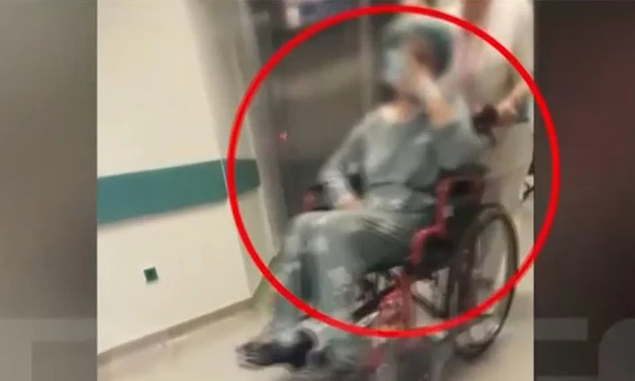 Η γυναίκα διακρίνεται σε αναπηρικό αμαξίδιο, κρατώντας μια μάσκα και κρύβοντας τα τραύματα στο πρόσωπό της, με βάση την εικόνα που δημοσίευσε το Live News.