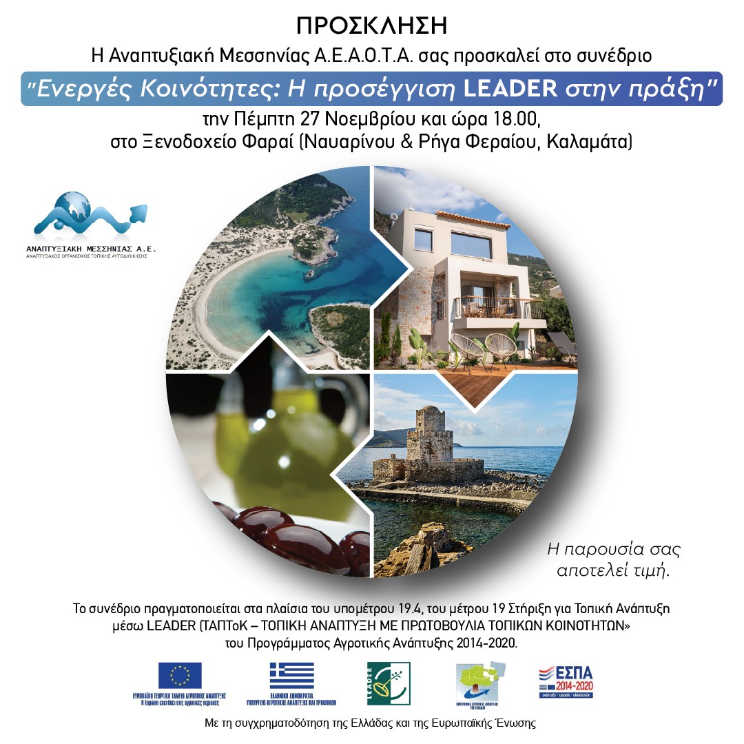 Η Αναπτυξιακή Μεσσηνίας ΑΕ Α.ΟΤΑ, ως Ομάδα Τοπικής Δράσης, για την εφαρμογή του προγράμματος CLLD/Leader 2014-2020 διοργανώνει συνέδριο με θέμα «Ενεργές Κοινότητες: Η προσέγγιση leader στη Μεσσηνία» την Πέμπτη 27 Νοεμβρίου 2025, στο ξενοδοχείο «Φαραί», στην Καλαμάτα.