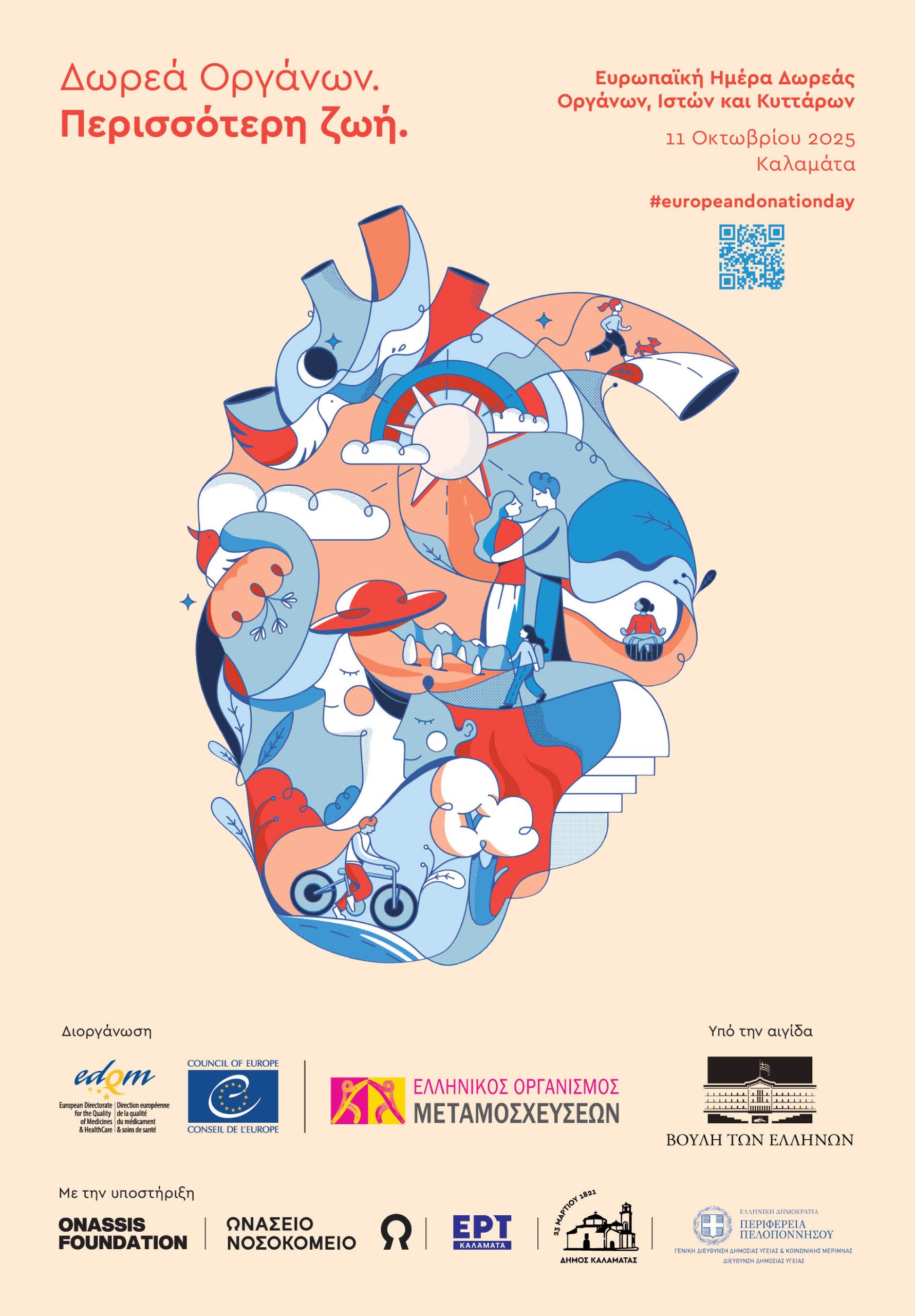Το Σάββατο 11 Οκτωβρίου του 2025, η Ελλάδα έχει την τιμή να φιλοξενεί στην Καλαμάτα την «Ευρωπαϊκή Ημέρα Δωρεάς Οργάνων, Ιστών και Κυττάρων», υπό την αιγίδα της Βουλής των Ελλήνων. Με το μήνυμα «Δωρεά Οργάνων, Περισσότερη Ζωή», το δώρο ζωής από άνθρωπο σε άνθρωπο, μπαίνει στο επίκεντρο του δημόσιου διαλόγου. Με συμβολικές δράσεις σε όλη τη χώρα, αλλά και με τις εκδηλώσεις, που διοργανώνει κάθε ευρωπαϊκή χώρα την ημέρα αυτή, το σημαντικό μήνυμα θα μεταδοθεί, με σκοπό τη δημιουργία περισσότερων ευκαιριών ζωής για κάθε Ευρωπαίο πολίτη.