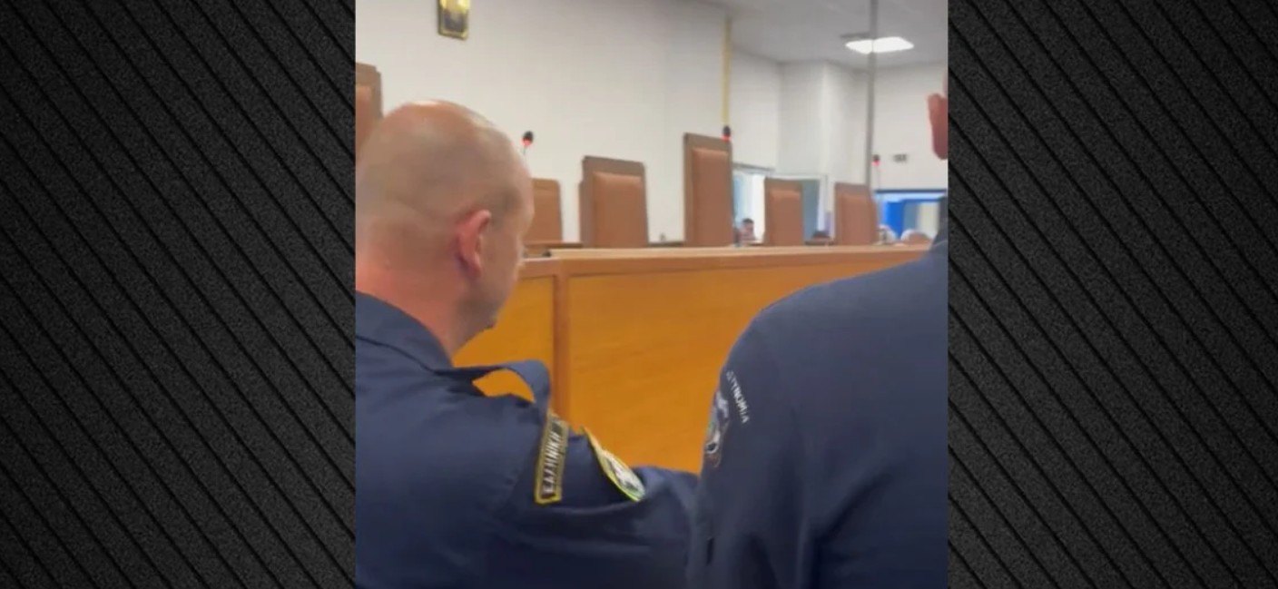 Στο βίντεο μέσα από την αίθουσα του δικαστηρίου, η πρόεδρος της Πλεύσης Ελευθερίας απευθύνεται στους αστυνομικούς που είχαν τοποθετηθεί μπροστά από τα έδρανα των δικηγόρων.