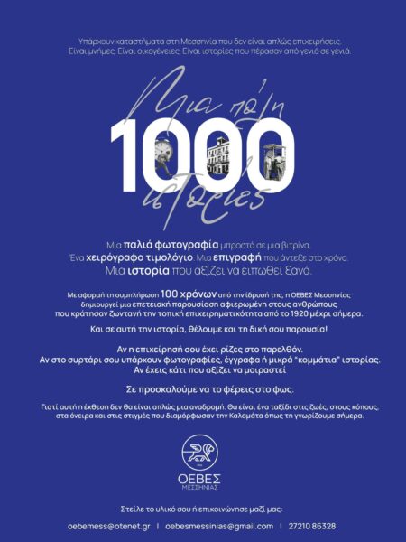 Η ΟΕΒΕΣ Μεσσηνίας, στο πλαίσιο της επετειακής συμπλήρωσης 100 χρόνων από την ίδρυσή της, προχωρά στη δημιουργία μιας ειδικής παρουσίασης αφιερωμένης στην ιστορία της τοπικής επιχειρηματικότητας.