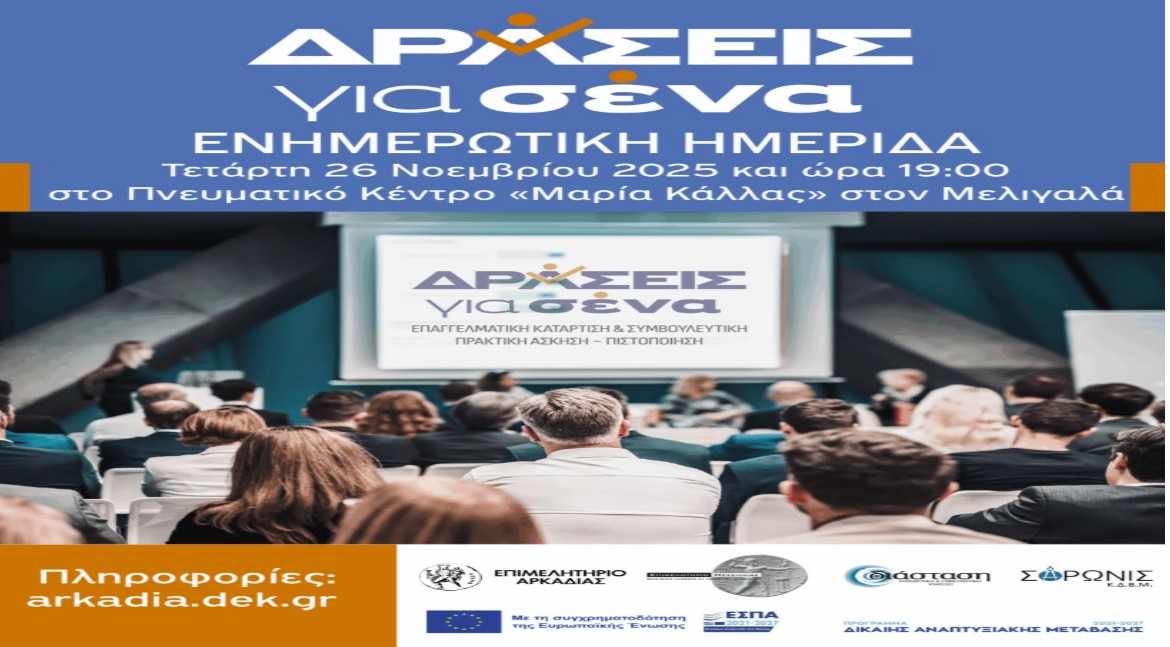 Το Επιμελητήριο Μεσσηνίας και το Επιμελητήριο Αρκαδίας, ως φορείς υλοποίησης του έργου «Ολοκληρωμένα Προγράμματα προώθησης στην απασχόληση στην περιοχή εφαρμογής του Εδαφικού Σχεδίου Δίκαιης Μετάβασης Μεγαλόπολης» (MIS 6001123), σε συνεργασία με τον Δήμο Οιχαλίας, διοργανώνουν την Κεντρική Ενημερωτική Ημερίδα Προσέλκυσης για το πρόγραμμα «Δράσεις για Σένα».