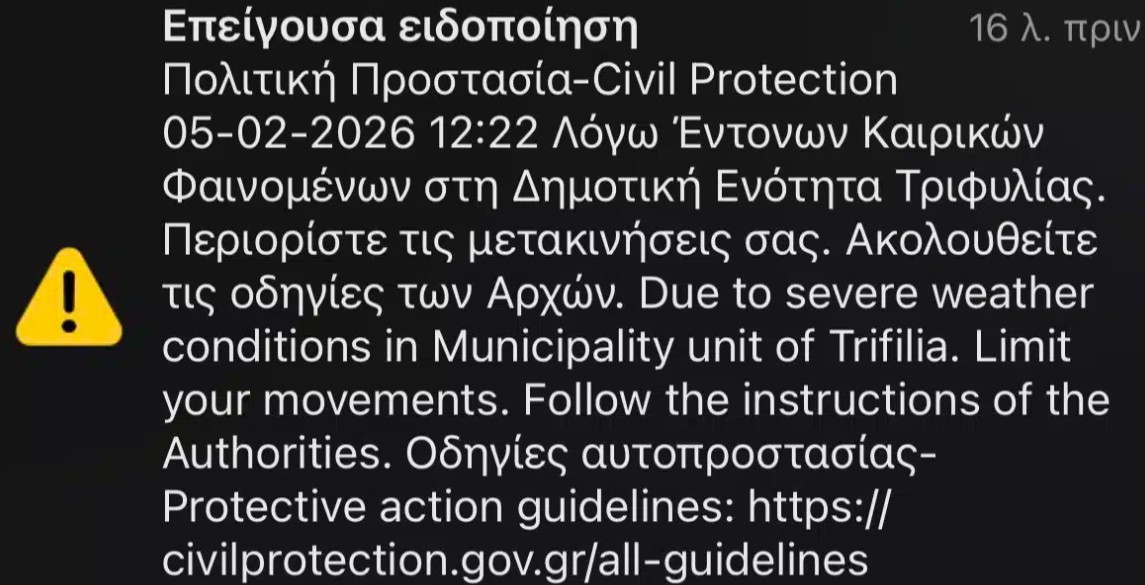 Στο μεταξύ, η Πολιτική Προστασία, με επείγουσα ειδοποίηση στις 12:22 (05-02-2026), ζητά τον περιορισμό των μετακινήσεων και την τήρηση των οδηγιών των Αρχών, παραπέμποντας και στις οδηγίες αυτοπροστασίας στη διεύθυνση: https://civilprotection.gov.gr/all-guidelines.
