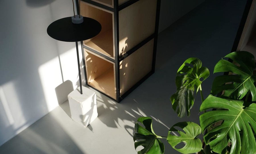 Το διαχωριστικό έπιπλο που χωρίζει την κουζίνα από το υπνοδωμάτιο είναι ο νοητός άξονας του σπιτιού. «Αποτελείται από μεταλλικό σκελετό στον οποίο εφαρμόζουν ξύλινα αποθηκευτικά κουτιά, που εναλλάσσονται ανάλογα με τις ανάγκες», εξηγεί ο αρχιτέκτονας.