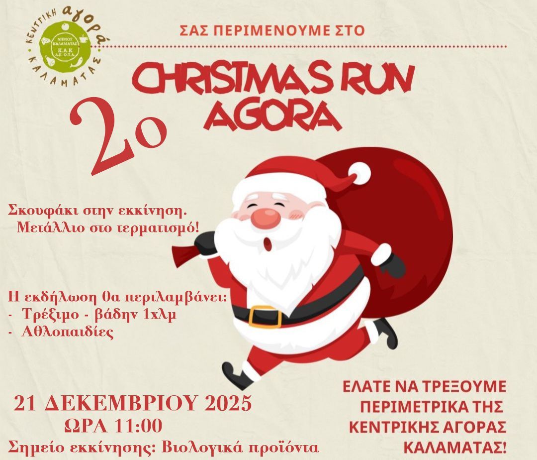 Την Κυριακή 21 Δεκεμβρίου 2025, έρχεται το 2ο “Agora Christmas Run” για μικρούς και μεγάλους! Τρέχουμε ή περπατάμε περιμετρικά της Κεντρικής Αγοράς Καλαμάτας, με τον Άη Βασίλη να δίνει το σύνθημα έναρξης στις 11 το πρωί. Η αφετηρία του αγώνα θα είναι στον χώρο των Βιολογικών Προϊόντων. Πριν το τρέξιμο κάθε παιδί θα πάρει δώρο το σκουφάκι του Αη Βασίλη και στον τερματισμό ένα μετάλλιο.