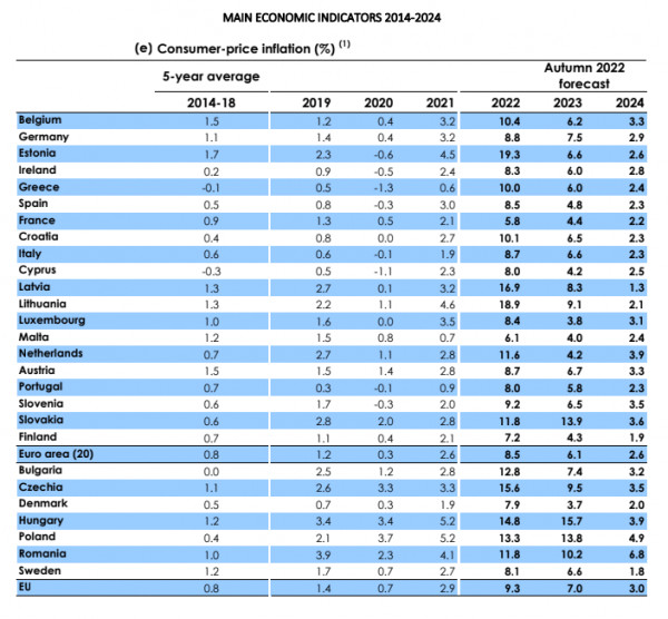 Σε ό,τι αφορά τον πληθωρισμό, η Επιτροπή προβλέπει ότι στην Ελλάδα θα διαμορφωθεί στο 10% το 2022 και θα μειωθεί στο 6% το 2023 και στο 2,4% το 2024. Για την ευρωζώνη, η Επιτροπή προβλέπει πληθωρισμό στο 8,5% το 2022, στο 6,1% το 2023 και στο 2,6% το 2024. Στην ΕΕ προβλέπεται ο πληθωρισμός να φτάσει το 9,3% το 2022 και να μειωθεί στο 7% το 2023 και στο 3% το 2024.
