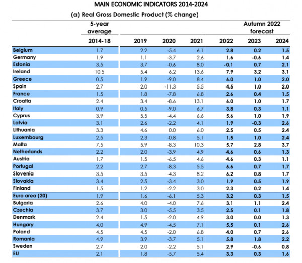Για την ευρωζώνη, η Επιτροπή προβλέπει ανάπτυξη 3,2% το 2022, 0,3% το 2023 και 1,5% το 2024, έναντι ανάπτυξης στην ΕΕ της τάξεως του 3,3% το 2022, 0,3% το 2023 και 1,6% το 2024.