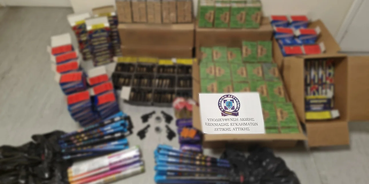 Αττική: Συνελήφθη ημεδαπός, καθώς σε κατάστημα υγειονομικού ενδιαφέροντος βρέθηκαν πάνω από 22.000 κροτίδες καθώς και καπνογόνα, εκτοξευόμενα πυροτεχνήματα, πιστόλια εκτόξευσης φωτοβολίδων κ.α.