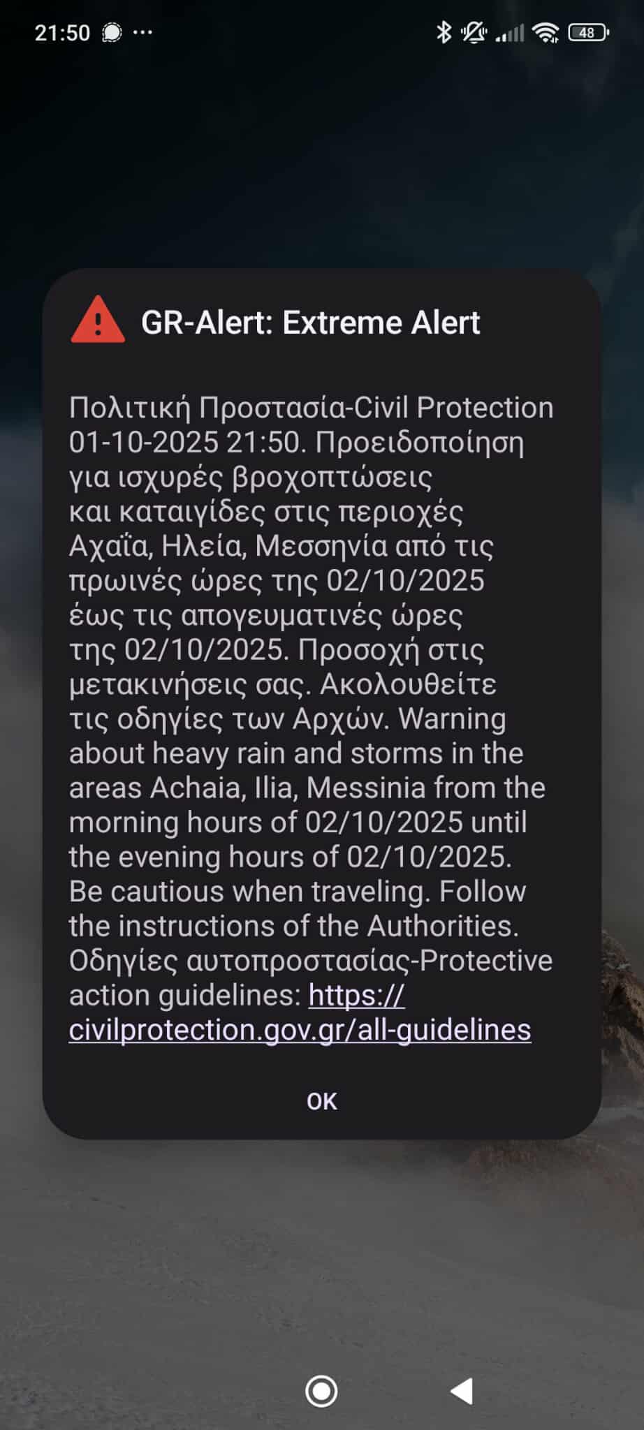 Μήνυμα από τον αριθμό έκτακτης ανάγκης 112 έλαβαν οι πολίτες σε Μεσσηνία, Ηλεία και Αχαΐα με προειδοποίηση για ισχυρές βροχοπτώσεις και καταιγίδες.