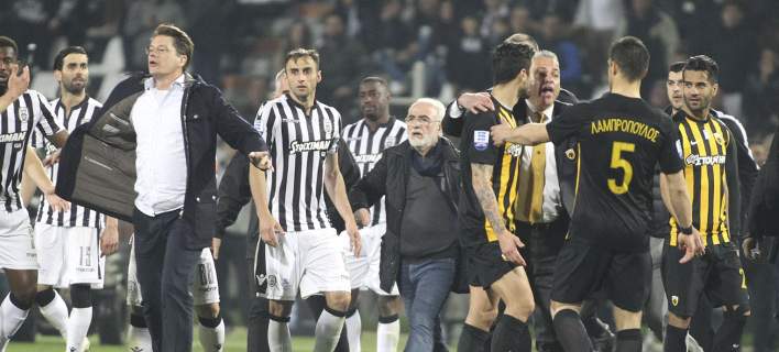 Στο 90′ του ντέρμπι ΠΑΟΚ-ΑΕΚ οι γηπεδούχοι σκόραραν με αμφισβητούμενο γκολ. Αρχικά ο διαιτητής Γιώργος Κομίνης το ακύρωσε και τότε επικράτησε το απόλυτο χάος στο γήπεδο. Οι πάγκοι των δύο ομάδων εισέβαλαν στον αγωνιστικό χώρο, ενώ στο χορτάρι κατέβηκε με συνοδεία μπράβων και ο Ιβάν Σαββίδης. Μάλιστα σοκ προκάλεσαν οι εικόνες που έδειχναν να τον μεγαλομέτοχο της ΠΑΕ ΠΑΟΚ να φέρει επάνω του περίστροφο!
