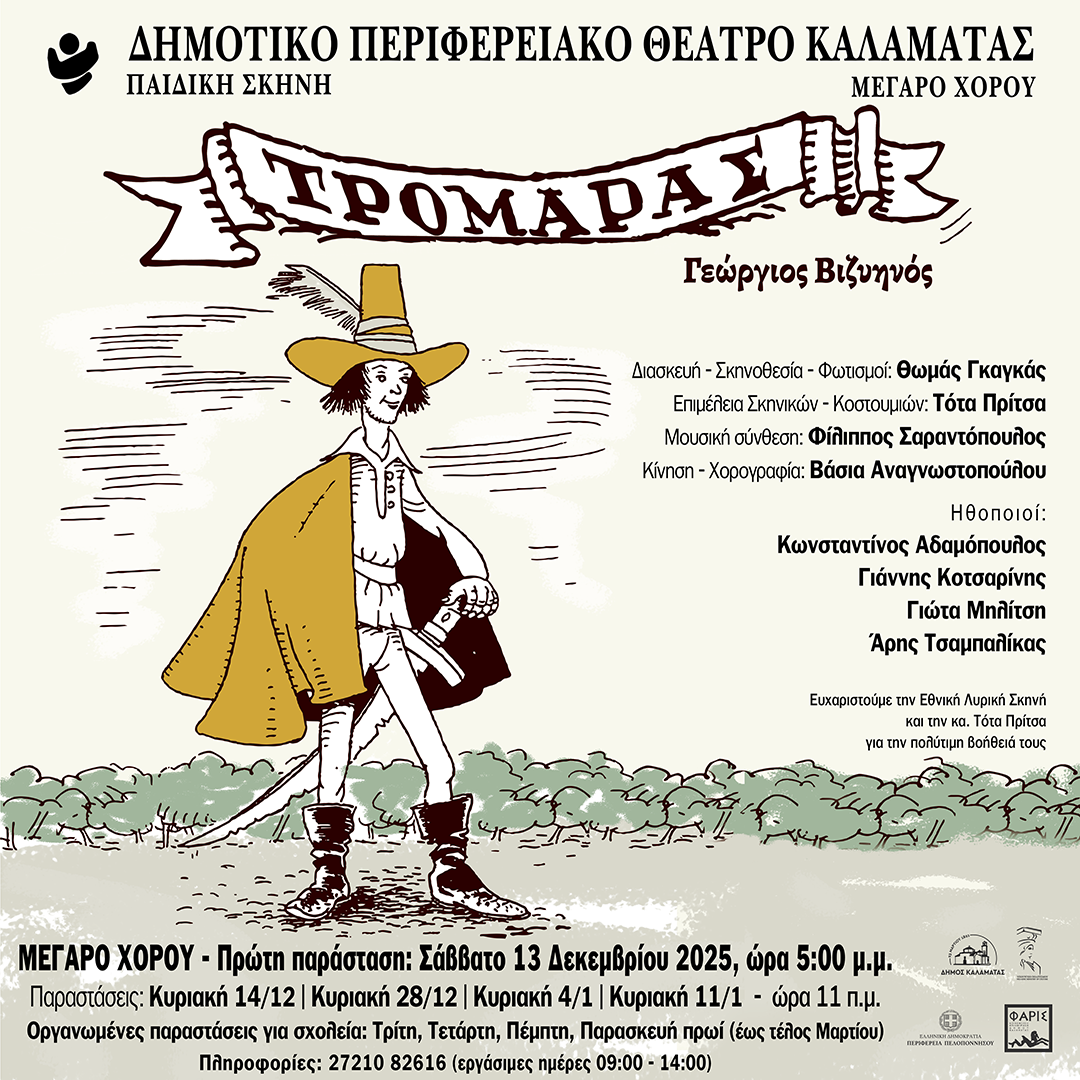 Η Παιδική Σκηνή του Δημοτικού Περιφερειακού Θεάτρου Καλαμάτας παρουσιάζει για τη χειμερινή περίοδο 2025-2026, το αριστούργημα του Γιώργου Βιζυηνού “Τρομάρας”. Το έργο είναι γραμμένο το 1884 και θεωρείται από τους ειδικούς ως το πρώτο διήγημα για παιδιά στην ιστορία της σύγχρονης πεζογραφίας.