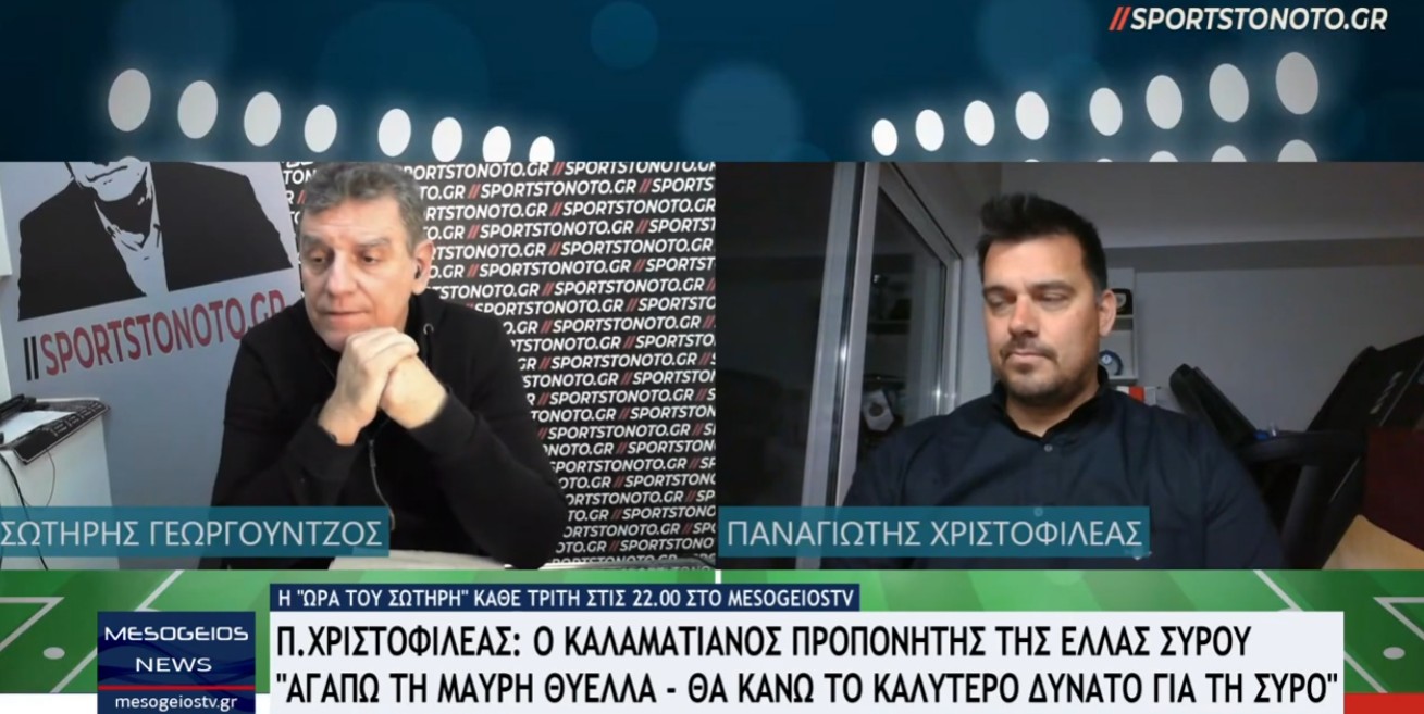 Στην Ωρα του Σωτήρη και στον Σωτήρη Γεωργούντζο μίλησε κυριολεκτικά για όλους και για όλα ο Καλαματιανός προπονητής της Ελλάδας Σύρου Παναγιώτης Χριστοφιλέας. Ο νεαρός και ιδιαίτερα ανερχόμενος τεχνικός αναφέρθηκε φυσικά και στο μεγάλο παιχνίδι της Κυριακής στη Σύρο ανάμεσα στην Ελλάς Σύρου και στη Μαύρη Θύελλα, με τον Μανιάτη προπονητή να εκφράζει δημόσια την μεγάλη του αγάπη για την Καλαμάτα,