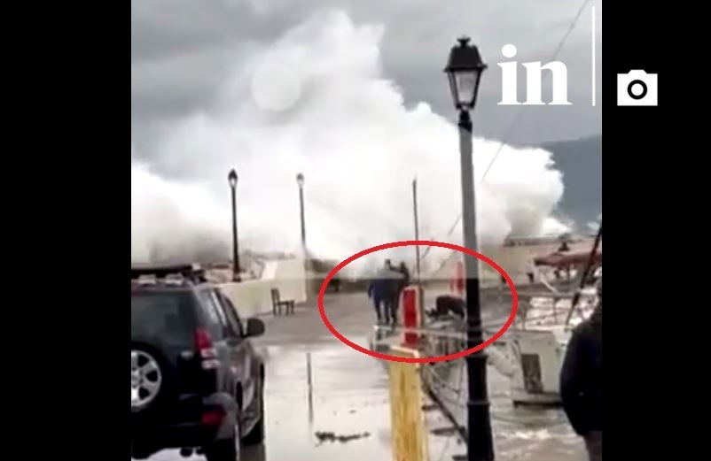Τεράστια κύματα σκάνε στον μόλο και παρασύρουν 2 με 3 στελέχη του Λιμενικού που είχαν σπεύσει στο σημείο για παροχή βοήθειας.