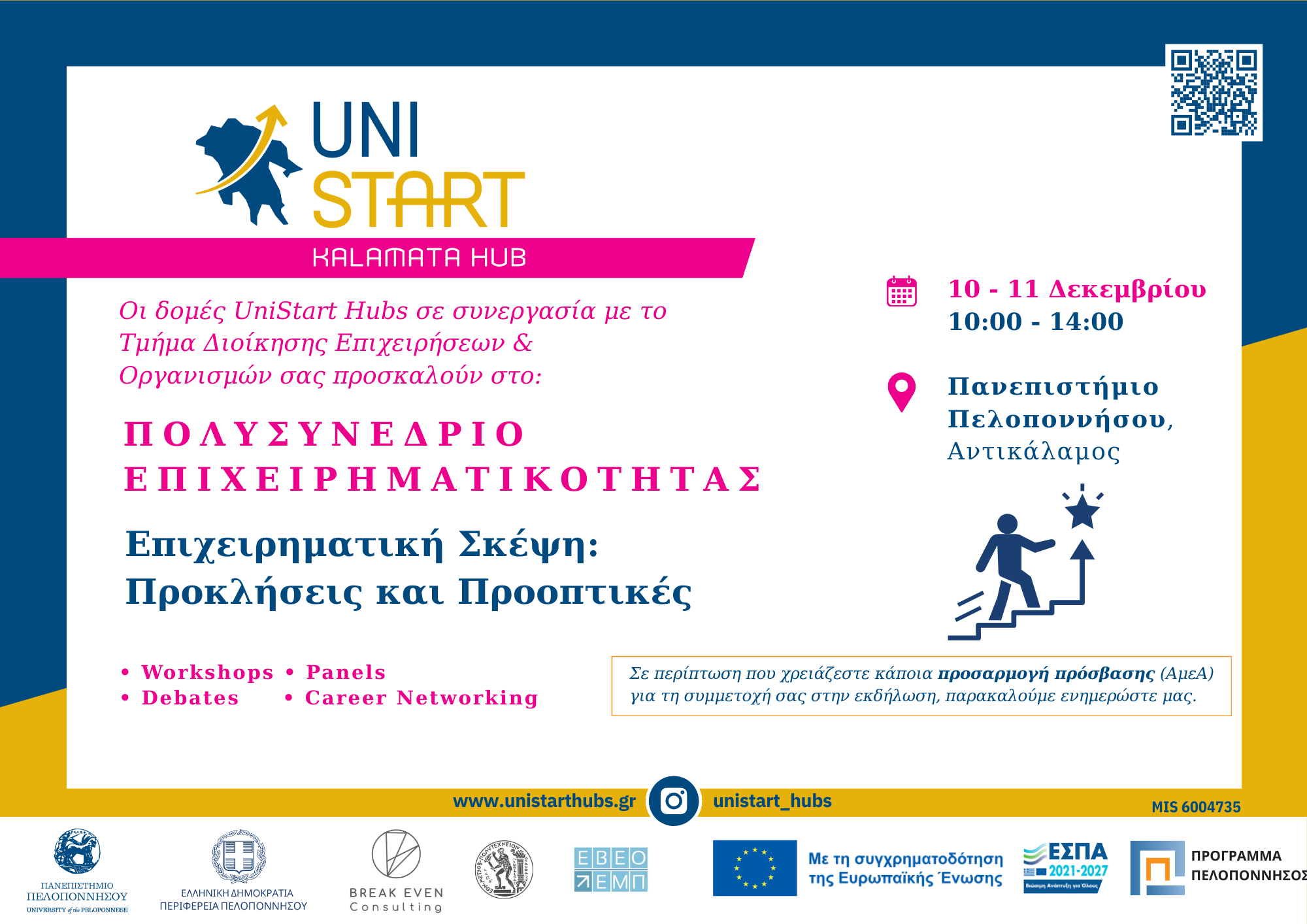Την Τετάρτη 10 και την Πέμπτη 11 Δεκεμβρίου 2025, και ώρα 10.00 – 14.00, τα UniStart Hubs σας προσκαλούν στο 2ο Πολυσυνέδριο Επιχειρηματικότητας «Επιχειρηματική Σκέψη: Προκλήσεις και Προοπτικές», που διοργανώνεται σε συνεργασία με το Τμήμα Διοίκησης Επιχειρήσεων και Οργανισμών του Πανεπιστημίου Πελοποννήσου. Η εκδήλωση θα πραγματοποιηθεί στις εγκαταστάσεις του Πανεπιστημίου Πελοποννήσου στον Αντικάλαμο και απευθύνεται σε φοιτητές, υποψήφιους διδάκτορες, νέους ερευνητές, αποφοίτους, επιχειρηματίες και επαγγελματίες που ενδιαφέρονται να εξερευνήσουν τις νέες πραγματικότητες της αγοράς εργασίας, της επιχειρηματικότητας και της καινοτομίας.