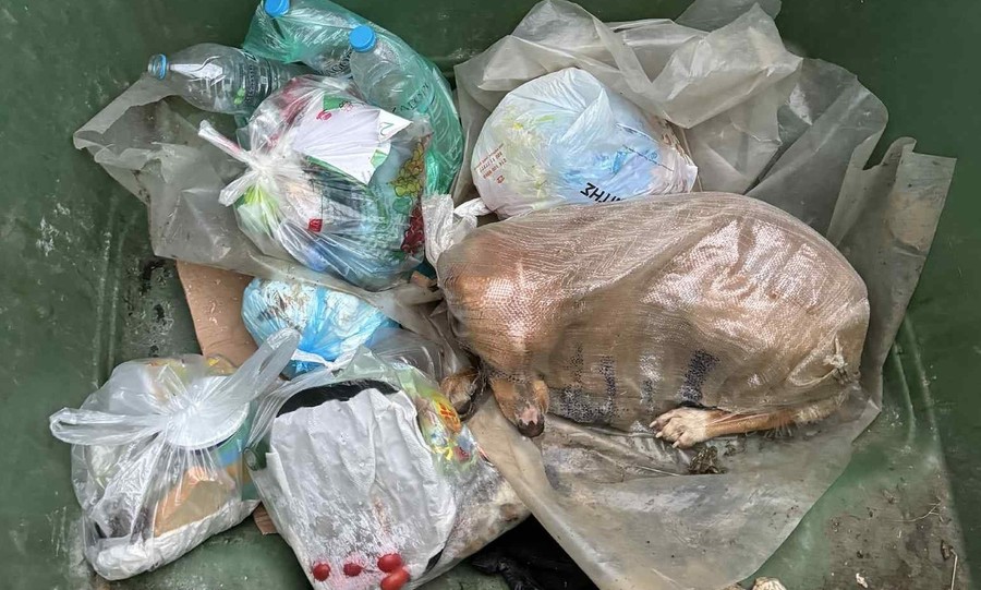 Το απόγευμα του Σαββάτου ένας πολίτης εντόπισε μέσα σε κάδο απορριμμάτων ένα σκυλί κλεισμένο σε τσουβάλι, σε πολύ κακή κατάσταση.