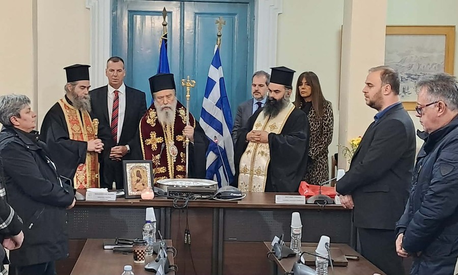 Λίγο πριν την έναρξη της συνεδρίασης του Δημοτικού Συμβουλίου, ο Σεβασμιώτατος ευλόγησε τη Βασιλόπιτα και απευθυνόμενος προς τα μέλη του Συμβουλίου ευχήθηκε καλή και δημιουργική χρονιά, γεμάτη πρωτίστως Υγεία.
