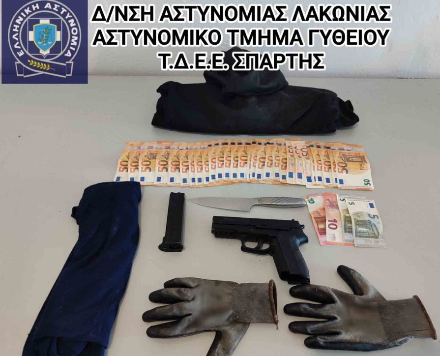 Ειδικότερα, όπως προέκυψε από την προανάκριση, προχθές (28.3.2026) το βράδυ ο 39χρονος μετέβη, έχοντας καλυμμένα τα χαρακτηριστικά του προσώπου του, σε κατάστημα μίνι μάρκετ στο Γύθειο και με την απειλή όπλου και αιχμηρού αντικειμένου, απέσπασε από παθούσα χρήματα από το ταμείο, καθώς και πορτοφόλι της που περιείχε χρηματικό ποσό και προσωπικά έγγραφα, ενώ στη συνέχεια τράπηκε σε φυγή.