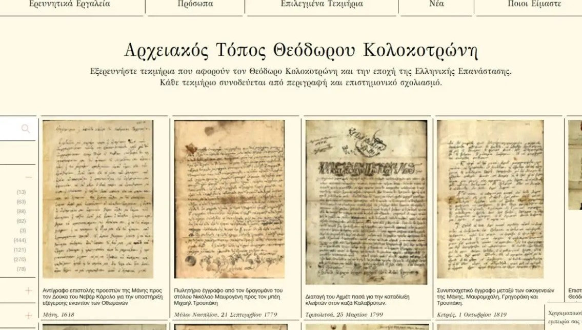 Σχεδόν 1.150 τεκμήρια, χρονολογημένα από τον Οκτώβριο του 1819 έως τον Σεπτέμβριο του 1833, που συνδέονται με τη ζωή και τη δράση του Θεόδωρου Κολοκοτρώνη, αλλά και την ιστορική κληρονομιά της Ελληνικής Επανάστασης του 1821, είναι πλέον προσιτά στους ερευνητές και στο ευρύ κοινό μέσα από την ιστοσελίδα kolokotronis-archive.org.