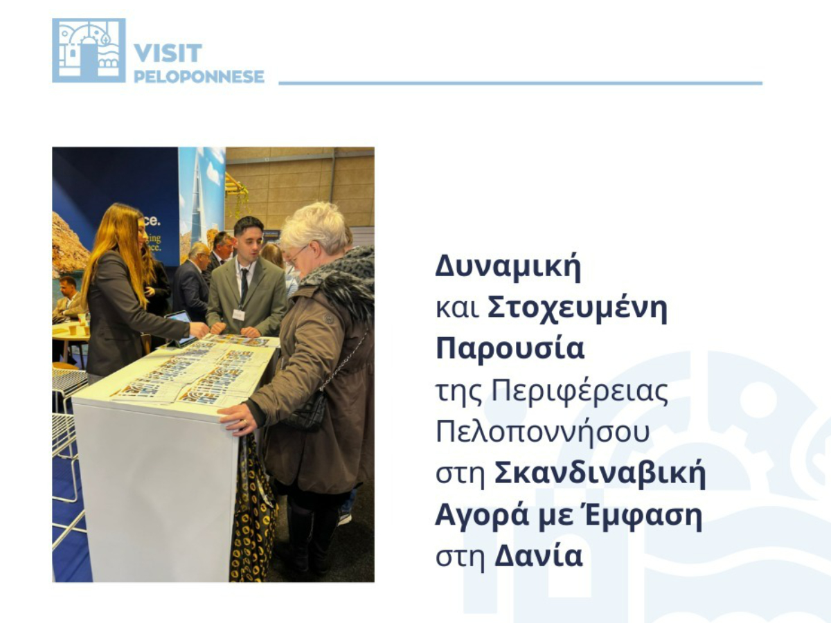 Η Περιφέρεια Πελοποννήσου συμμετείχε με επιτυχία στη διεθνή τουριστική έκθεση Ferie for Alle, η οποία πραγματοποιήθηκε στο Χέρνινγκ της Δανίας, ως συνεκθέτης στο εθνικό περίπτερο του Ελληνικού Οργανισμού Τουρισμού (ΕΟΤ), ενισχύοντας την παρουσία της στη σκανδιναβική αγορά.