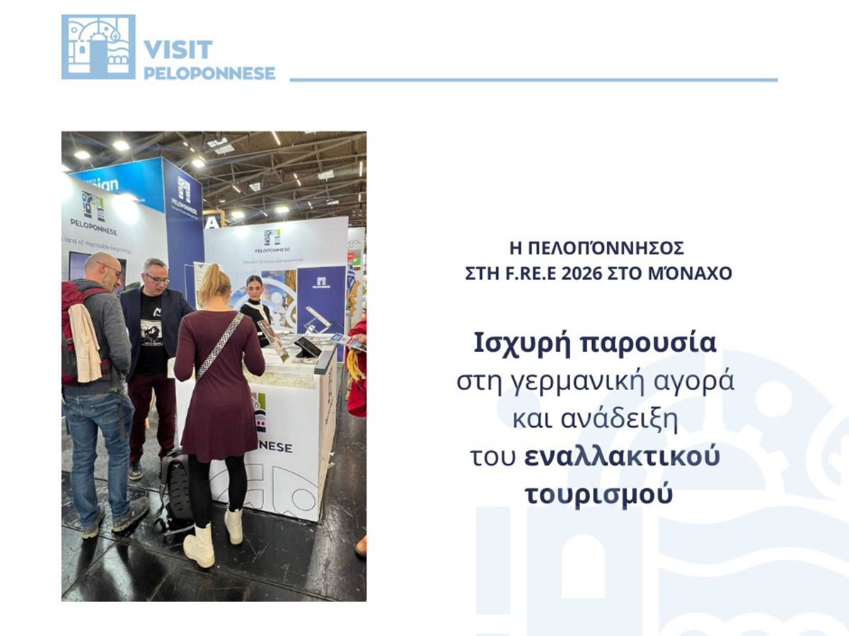 Η Περιφέρεια Πελοποννήσου συμμετείχε με αυτόνομο περίπτερο στη διεθνή τουριστική έκθεση f.re.e – The Travel and Leisure Fair, η οποία πραγματοποιήθηκε από τις 18 έως τις 22 Φεβρουαρίου 2026 στο Messe München, παράλληλα με τις διοργανώσεις IMOT και Munich Auto Days.